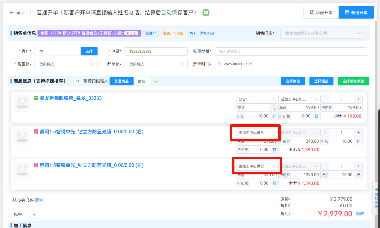 开单时,需要加工的商品的加工类型选择【送加工中心加工】,并选择【加工中心】,填写完成加工信息后、点击【结算】按钮保存销售单后,系统会自动生成内部加工单。后续的操作需要到库存系统 → 加工中心进行处理。