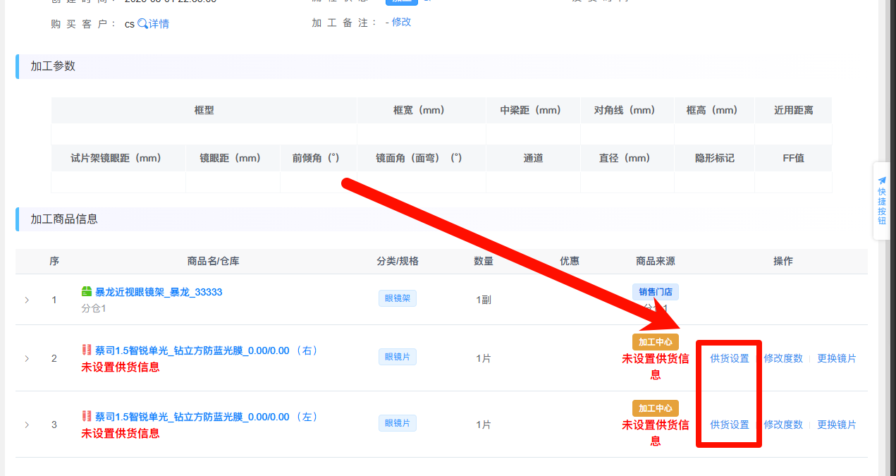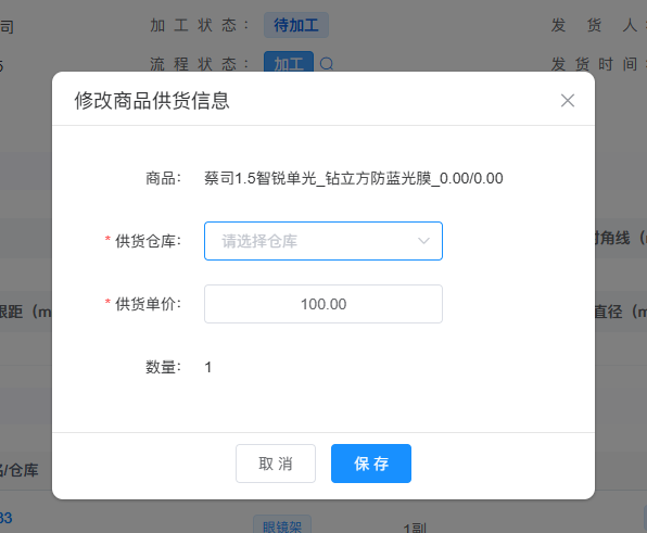 如加工单中有【由加工中心供货】的商品,则需要设置该商品的供货仓库。在加工单详情中,点击商品的【供货】设置按钮,可设置该商品的供货仓库,保存成功后,系统会从该仓库扣除商品数量。