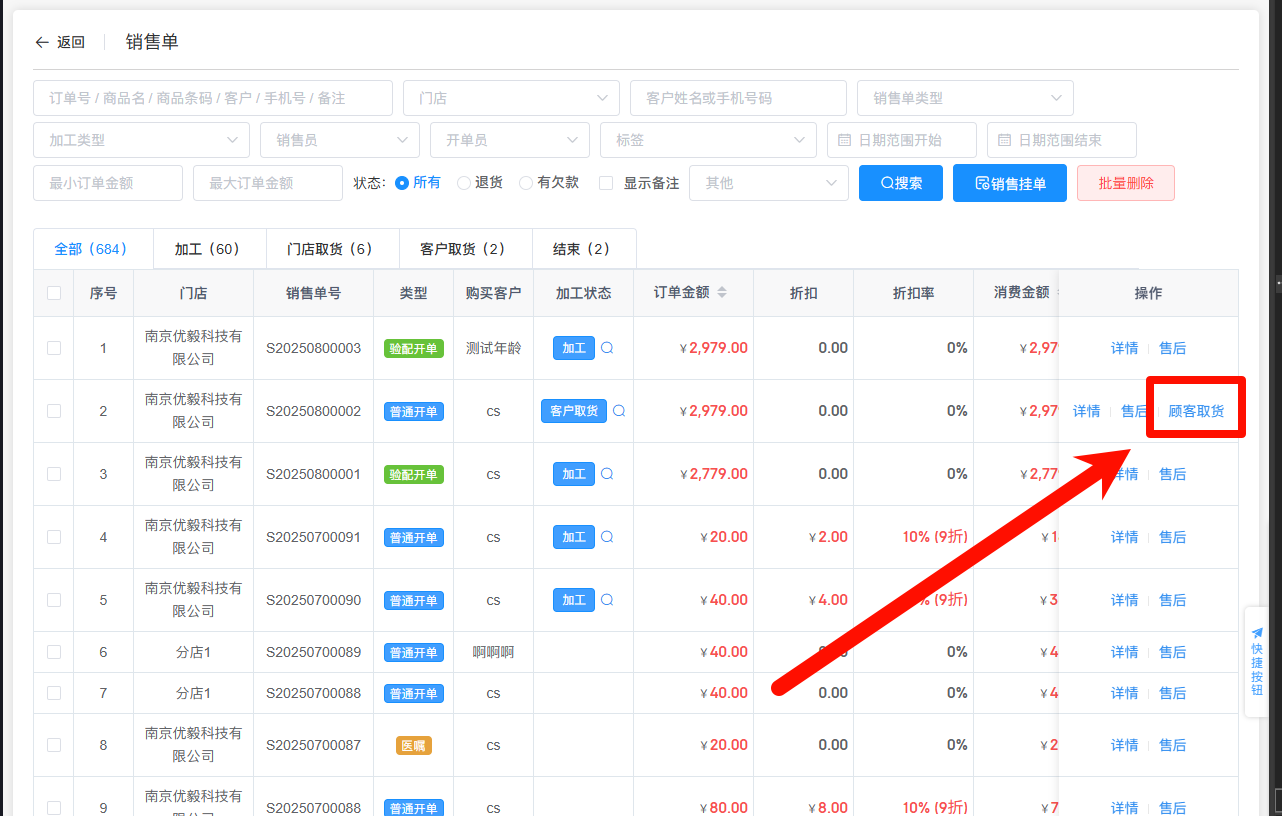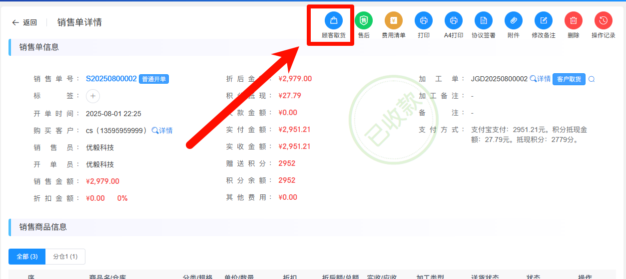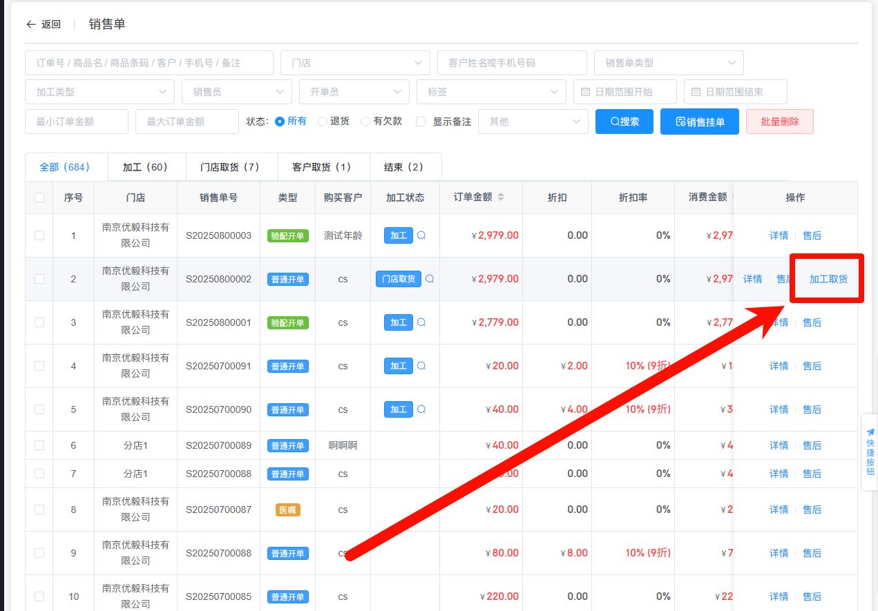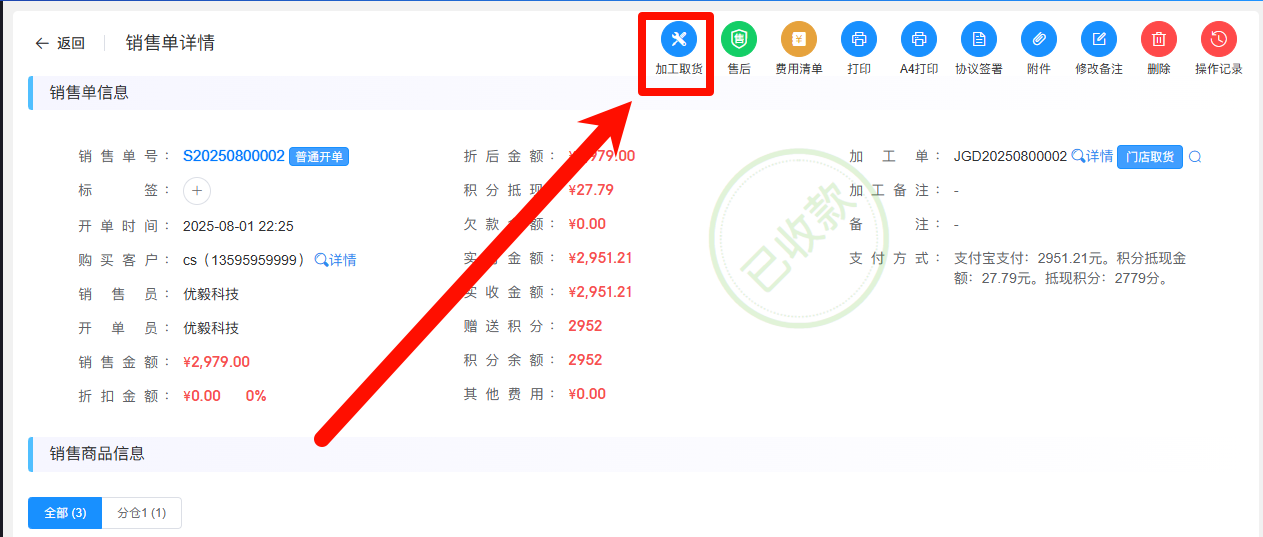 加工流程开启的情况下,加工完成后,销售门店需在销售单中点击【加工取货】来完成加工成品从加工中心取货到销售门店的操作。