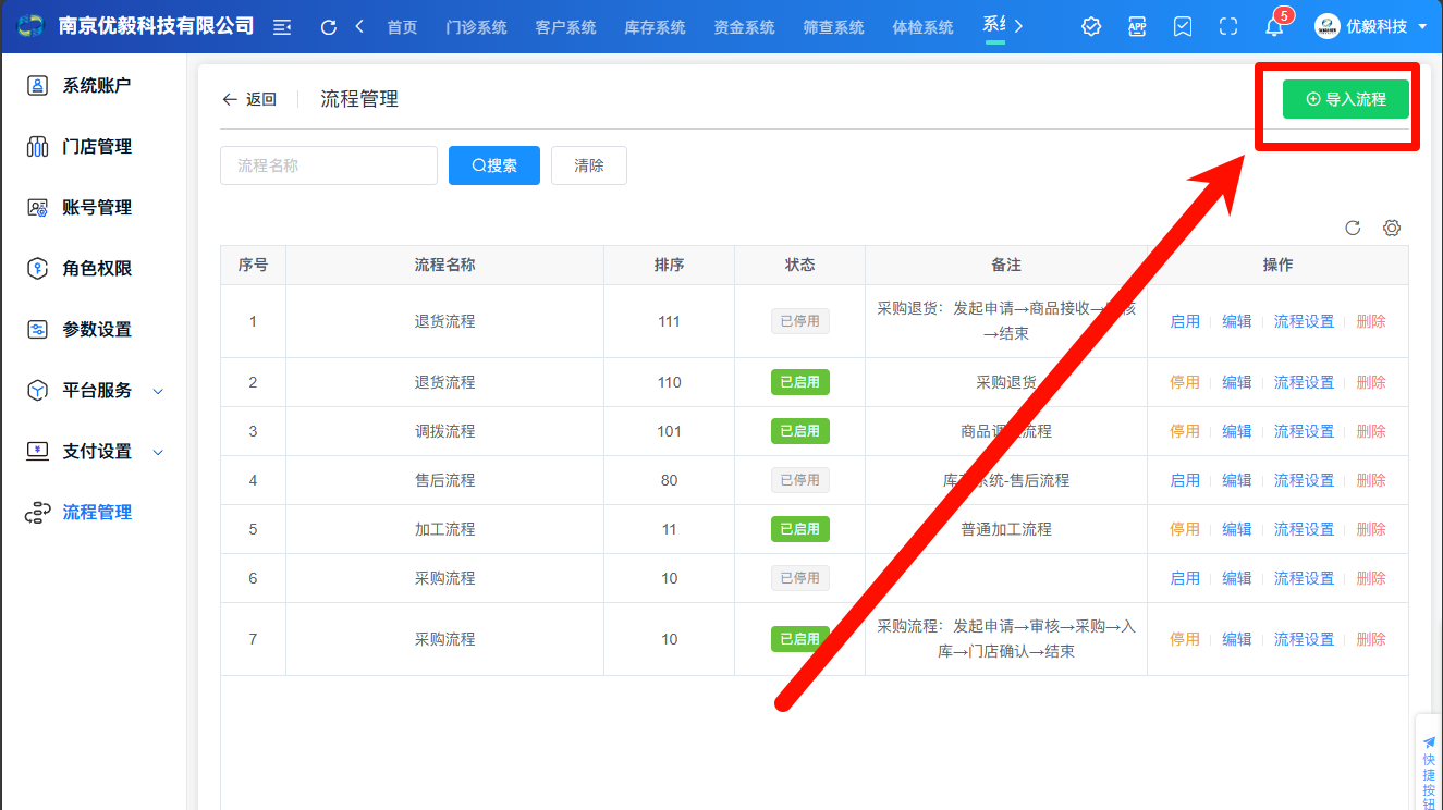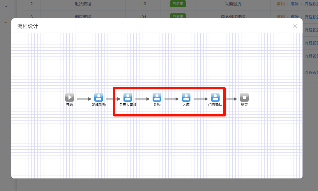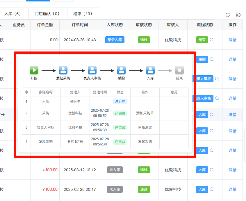 - 采购流程:发起采购 → 审核 → 采购 → 入库 → 门店确认