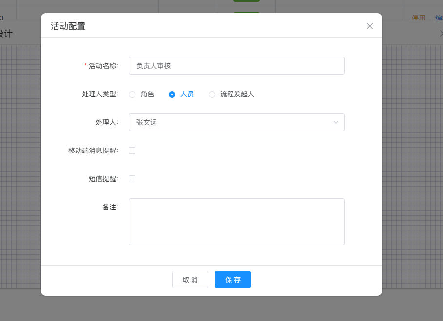 在流程设置中,可以对流程每个步骤的处理人和是否短信提醒进行配置。